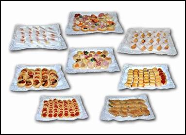 Rinfreschi / buffet con varie proposte salate (tramezzini, tartine, vol au vent, panini, pizzette, salatini rustici, torte salate, …) e pasticceria mignon.